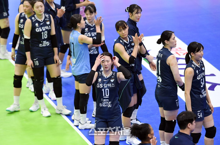 GS칼텍스 선수들이 10일 수원체육관에서 열린 2023-2024 V리그 여자부 현대건설과 경기에서 풀세트 접전 끝에 현대건설에 패한 뒤 팬들에게 인사를 하고 코트를 빠져나가고 있다. 2024. 1. 10. 수원 | 박진업 기자 upandup@sportsseoul.com