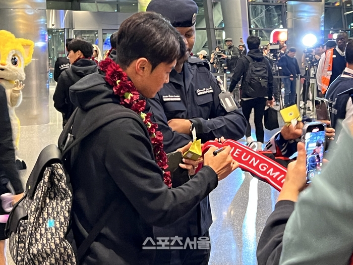 황희찬(울버햄턴), 김승규(알샤밥)와 가장 먼저 모습을 드러낸 김민재(바이에른 뮌헨) 역시 소속팀 유니폼을 들고 있는 팬에게 사인으로 화답했다. 김민재의 사인을 받은 여성 팬은 “유일하게 김민재에게 사인을 받았다”라며 활짝 웃었다.