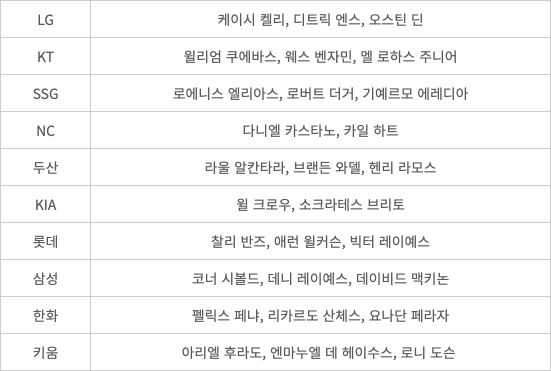 10구단 중 8구단이 영입을 마무리했다. 외국인 타자 한 명이 남은 NC, 외국인 투수 한 명이 남은 KIA 외에 새 시즌을 앞두고 캠프에서 마주할 28명의 외국인 선수가 확정됐다. 15명이 재계약을 맺었고 남은 15명은 새 얼굴로 채워진다.