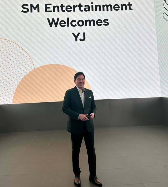 정 부회장은 SM엔터테인먼트에서 찍은 사진을 공개했다. 정 부회장의 등 뒤로 “SM엔터테인먼트가 정용진을 환영한다(SM Entertainment Welcomes YJ)”라는 문구가 쓰여 있다.