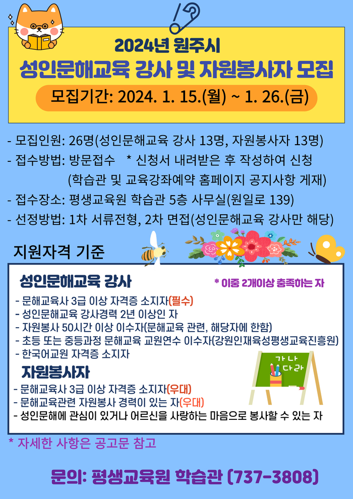 [스포츠서울ㅣ원주=김기원기자] 원주시 평생교육원 학습관은 오는 15일부터 26일까지 12일간 2024년 원주시 성인문해교육 강사와 자원봉사자를 모집한다.