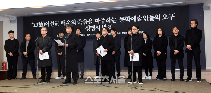 영화감독 봉준호와 가수 윤종신 등 문화예술인 연대회의(가칭) 소속 회원들이 12일 서울 중구 한국프레스센터 기자회견장에서 ‘고(故) 이선균 배우의 죽음을 마주하는 문화예술인들의 요구’ 성명서를 발표하고 있다. 앞줄 왼쪽부터 배우 김의성, 영화감독 봉준호, 가수 겸 작곡가 윤종신, 영화감독 이원태. 2024. 1. 12. 박진업기자 upandup@sportsseoul.com