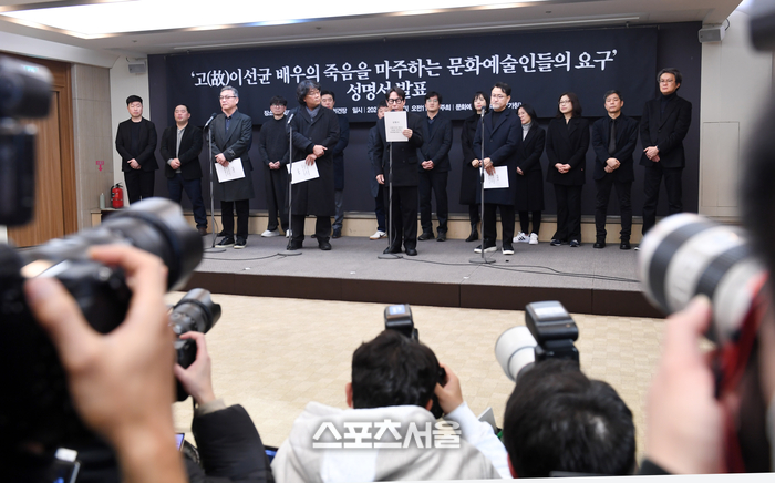 영화감독 봉준호와 가수 윤종신 등 문화예술인 연대회의(가칭) 소속 회원들이 12일 서울 중구 한국프레스센터 기자회견장에서 ‘고(故) 이선균 배우의 죽음을 마주하는 문화예술인들의 요구’ 성명서를 발표하고 있다. 앞줄 왼쪽부터 배우 김의성, 영화감독 봉준호, 가수 겸 작곡가 윤종신, 영화감독 이원태. 2024. 1. 12. 박진업기자 upandup@sportsseoul.com