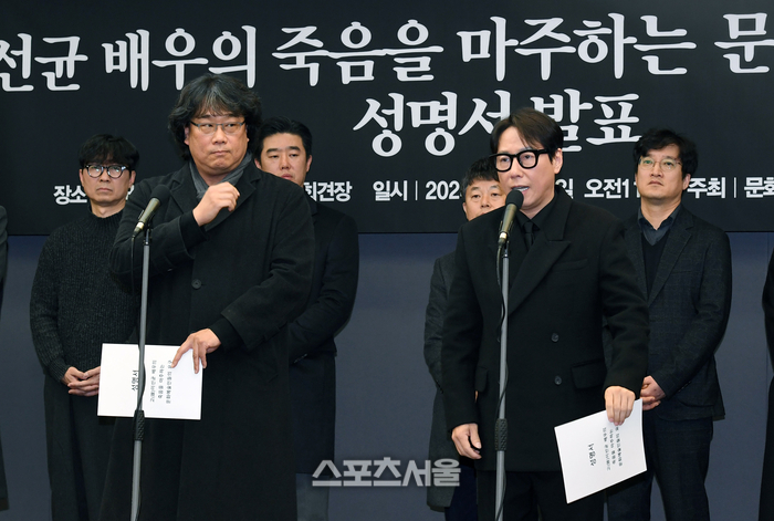 영화감독 봉준호(왼쪽)과 가수 윤종신 등 문화예술인 연대회의(가칭) 소속 회원들이 12일 서울 중구 한국프레스센터 기자회견장에서 ‘고(故) 이선균 배우의 죽음을 마주하는 문화예술인들의 요구’ 성명서를 발표하고 있다. 2024. 1. 12. 박진업기자 upandup@sportsseoul.com