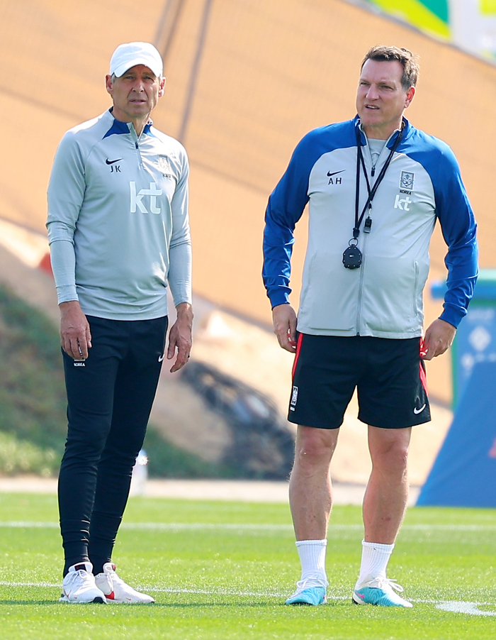 입국 당일 오전 휴식 후 오후 4시30분부터 본격 담금질에 들어갔다. ‘회복’에 초점을 맞춘 훈련을 진행했다. 클린스만 감독은 숙소에서 회복하는 쪽을 선택했는데, 선수들의 요청으로 그라운드로 나섰다.