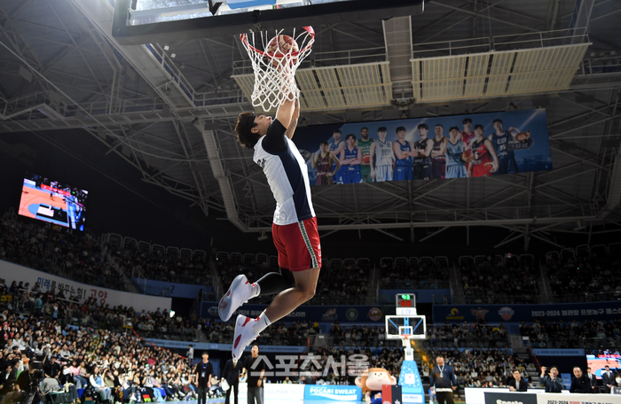 LG 저스틴 구탕이 14일 고양 소노 아레나에서 열린 2023-2024 프로농구 올스타전 덩크 콘테스트 결선에서 덩큐슛을 시도하고 있다.. 2024. 1. 14. 고양 | 최승섭기자 thunder@sportsseoul.com