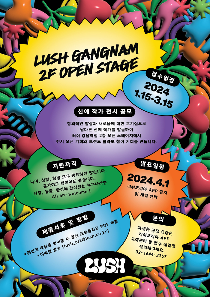 접수 방법은 본인의 작품 또는 콘텐츠를 보여줄 수 있는 포트폴리오를 러쉬코리아 공식 앱 공지사항 내 이메일(lush_art@lush.co.kr)을 통해 제출하면 된다. 수상자는 4월 1일 러쉬 공식 앱 공지 사항 및 개별 연락을 통해 발표할 예정이다.