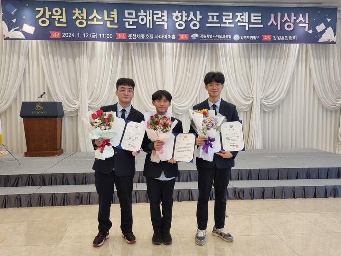 [스포츠서울ㅣ원주=김기원기자] 원주시 대성고등학교(교장 안봉호)는 지난 12일(금) 춘천세종호텔에서 열린 ‘강원 청소년 에세이 공모전’ 시상식에서 △2학년 조현웅 학생이 대상 △이민규, 권정우 학생이 금상 △김준엽 학생이 은상을 수상하였다고 밝혔다.