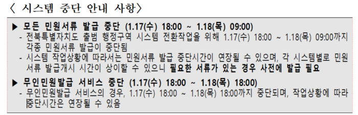전북특별자치도 출범 행정구역 시스템 전환작업을 위해 1월 17일(수) 18:00부터 1월 18일(목) 09시까지 각종 민원서류 발급이 중단된다. 또한 작업상황에 따라 중단시간은 연장될 수 있다.