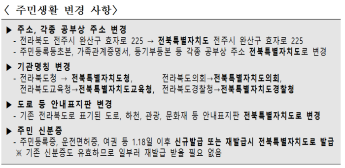 18일부터 전북도민의 주민등록 주소가 일제히 전북특별자치도로 변경되고, 기관명칭도 전북특별자치도청, 전북특별자치도의회, 전북특별자치도교육청 등으로 바뀐다.