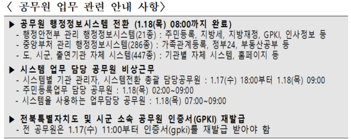 공무원의 경우, 관리 중인 각종 시스템에 대한 전환작업을 18일 08시까지 완료하기 위해 비상근무를 실시해야 하며, 특히 전북특별자치도 및 시군 소속 공무원은 변경된 행정정보시스템에 접속해 업무처리를 하기 위해 17일 11시부터 행정전자서명 인증서(GPKI)를 발급받아야 한다.