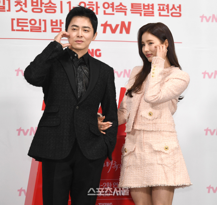조정석, 신세경이 16일 서울 라마다 신도림 호텔에서 열린 tvN ‘세작, 매혹된 자들’ 제작발표회에서 포토타임을 갖고 있다. 오는 21일 첫 방송을 앞둔 tvN 새 토일드라마 ‘세작, 매혹된 자들은 높은 자리에 있지만 마음은 비천한 임금 이인(조정석 분)과 그를 무너뜨리기 위해 세작(첩자)이 된 여인의 잔혹한 운명을 그린 이야기다. 2024. 1. 16. 최승섭기자 thunder@sportsseoul.com