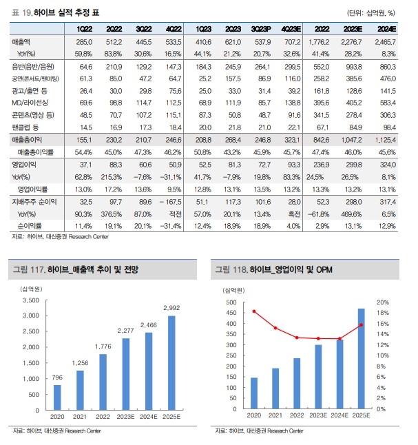 1위 팬덤 플랫폼인 위버스 가치가 높다. 대신증권에 따르면 2024년 매출 2조 4657억원(YoY +8.3%), 영업이익 3240억원(YoY +8.1%)을 전망한다. 또한 서구권에서 활발한 IP사업을 통해 팬덤 또한 더욱 확대할 것으로 보인다. 그리고 방탄소년단 멤버 전원이 군대에 입대함으로써 그동안 악재로 반영됐던 부분은 모두 해소됐다는 평가다.