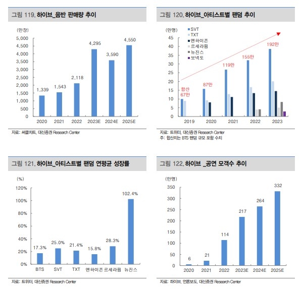 뉴진스, 르세라핌, 세븐틴, 보이넥스트도어, 엔하이픈, TXT 등 하이브 내 아티스트들이 음원, 광고, 방송에서 활약하고 있으며 앞으로 6인조 신인 보이그룹 투어스(TWS)가 22일 정식 데뷔한다. 상반기엔 걸그룹 아일릿이 5인조로 재편돼 데뷔한다. 중순엔 6인조 미국 현지화 걸그룹 ‘캣츠아이(KATSEYE가 모습을 드러낼 예정이다. 이처럼 여러 신인이 데뷔하며 성장 모멘텀을 다질 것으로 보인다.