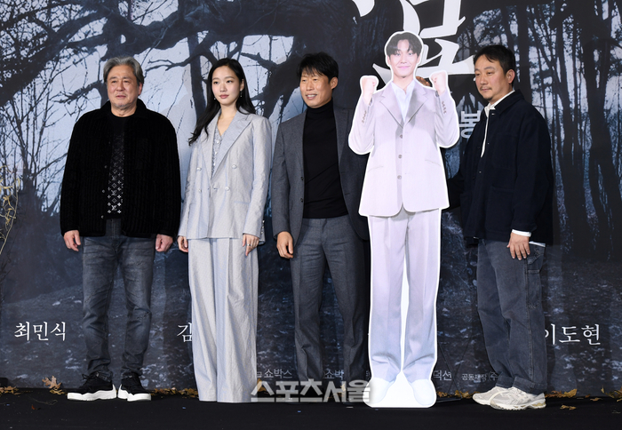 17일 서울 중구 더플라자호텔에서 진행된 영화 ‘파묘’ 제작보고회에서 출연 배우들이 취재진을 향해 포즈를 취하고 있다. 왼쪽부터 배우 최민식, 김고은, 유해진, 이도현 등신대, 장재현 감독. 영화 ‘파묘’는 거액의 돈을 받고 수상한 묘를 이장한 풍수사와 장의사, 무속인들에게 벌어지는 기이한 사건을 담은 오컬트 미스터리 영화로 배우 최민식, 김고은, 유해진, 이도현 등이 출연하며 장재현 감독이 연출을 맡았다. 2024. 1. 17. 박진업 기자 upandup@sportsseoul.com