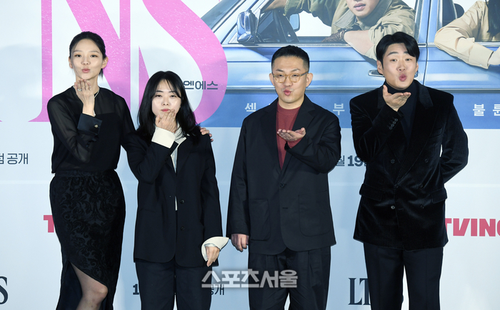 17일 서울 용산구 CGV 아이파크몰에서 진행된 티빙 오리지널 ‘LTNS’ 제작발표회에서 주연 배우들과 연출자들이 취재진을 향해 포즈를 취하고 있다. 왼쪽부터 배우 이솜, 전고운 감독, 임대형 감독, 배우 안재홍. 짠한 현실에 관계마저 소원해진 부부 ‘우진’(이솜)과 ‘사무엘’(안재홍)이 돈을 벌기 위해 불륜 커플들의 뒤를 쫓으며 일어나는 불륜 추적 활극으로 임대형 감독과 전고운 감독이 공동 연출을 맡았다. 2024. 1. 17. 박진업 기자 upandup@sportsseoul.com