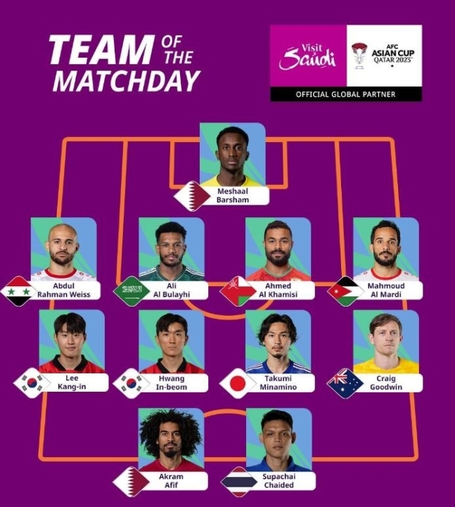 아시아축구연맹(AFC)은 17일 소셜미디어를 통해 카타르 아시안컵 조별리그 1차전 12경기에서 최고의 활약을 펼친 11명을 뽑아 공개했다.