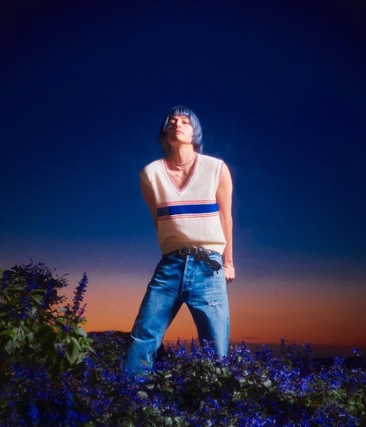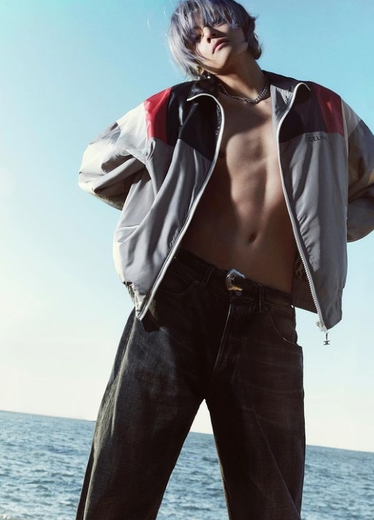 사진에는 푸른빛 머리를 한 뷔의 모습이 담겼다. 화보 속 뷔는 복근을 드러내며 신비로운 분위기를 풍겼다.