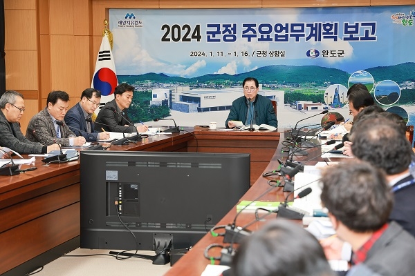 [스포츠서울/조광태기자] 전남 완도군은 지난 1월 11일부터 16일까지 4일간 군청 상황실에서 군수, 부군수, 부서장, 팀장 등이 참석한 가운데 「2024 군정 주요 업무 계획 보고회」를 개최했다.