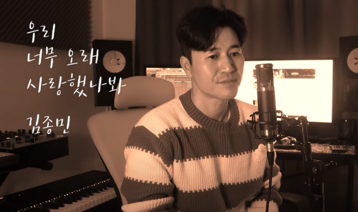 18일 유튜브 채널 ‘코요태레비전’에는 ‘김종민 인생 첫 커버 노래 _ 우리 너무 오래 사랑했나 봐’ 영상이 게재됐다. 영상 속 김종민은 코요태의 멤버 신지가 지난 11월 발매한 ‘우리 너무 오래 사랑했나 봐’를 부르고 있다. 그는 코믹한 이미지와는 달리 진지한 모습으로 열창하며 본업에 충실한 모습이다.