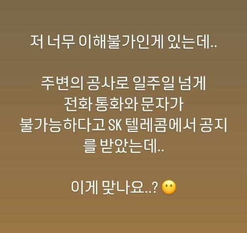 한예슬은 “주변의 공사로 일주일 넘게 전화 통화와 문자가 불가능하다고 SK텔레콤에서 공지를 받았는데 이게 맞나요?”라고 전했다.
