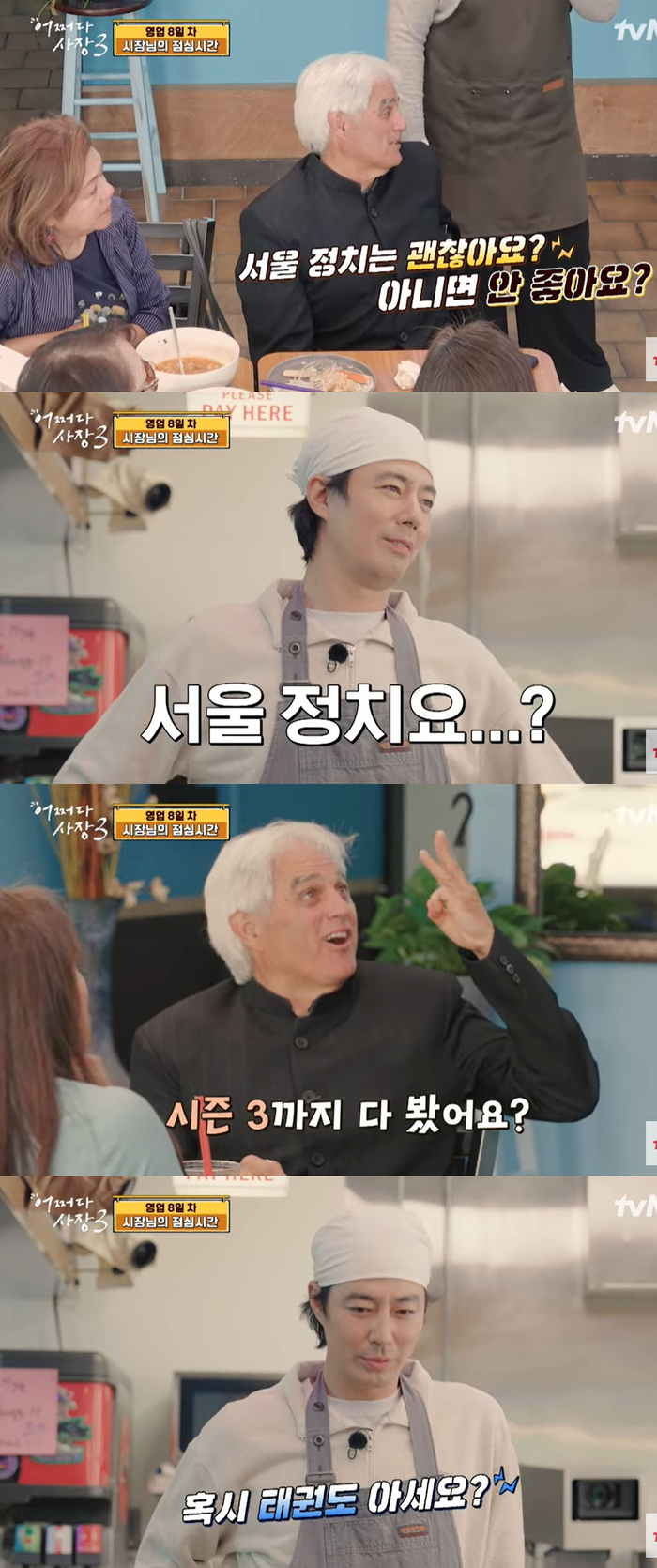 미남 배우 조인성 셰프에 눈길이 간 시장은 돌연 “서울 정치는 좋은가요, 나쁜가요?” “강아지랑 같이 자냐?” “인생의 목적이 뭐냐?” “배우가 아니었다면 어떤 직업을 했을 것같냐?” 등 인터뷰급 질문을 쏟아내 웃음을 안겼다.