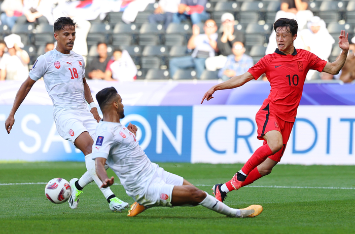 경기 초반은 고전했다. 바레인의 거친 파울과 밀집 수비 등에 막혔다. 바레인에는 경고를 아끼고, 한국에 옐로카드를 무려 5장이나 준 마 닝 주심의 이해할 수 없는 판정에 흔들리기도 했다. 하지만 주도권을 잡았다.