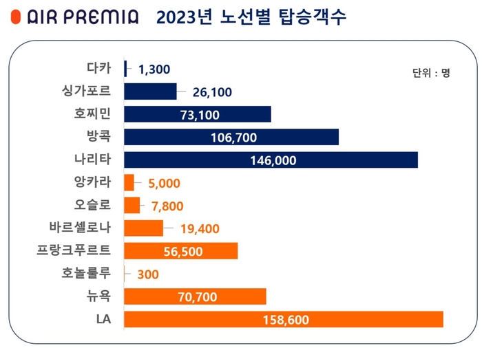 2023년은 에어프레미아가 출범한 이후 온전하게 1년을 수송한 첫 해로, 여객기가 5대까지 늘어나며 본격적인 장거리 운항을 시작한 해이기도 하다.