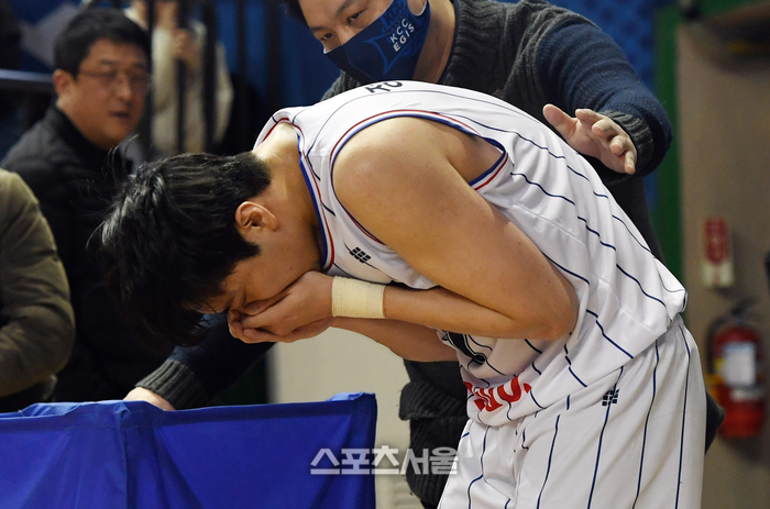 KCC 정창영이 21일 잠실실내체육관에서 열린 2023-2024 프로농구 삼성과 경기에서 코를 다친 뒤 고통스러워하고 있다. 2024. 1. 21. 잠실실내 | 박진업 기자 upandup@sportsseoul.com