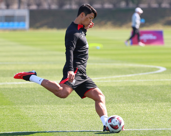 축구대표팀 윙어 황희찬(울버햄턴)은 21일 오후 카타르 도하의 알에글라 트레이닝 센터에서 팀 훈련에 본격 합류하기 30분 전 피치에 나와 트레이너와 함께 몸을 풀었다.