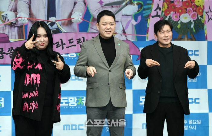 방송인 풍자(왼쪽)와 김구라(가운데), 아나운서 김대호가 22일 서울 마포구 MBC 골든마우스홀에서 진행된 ‘도망쳐 : 손절 대행 서비스’ 제작발표회에서 취재진을 향해 포즈를 취하고 있다.