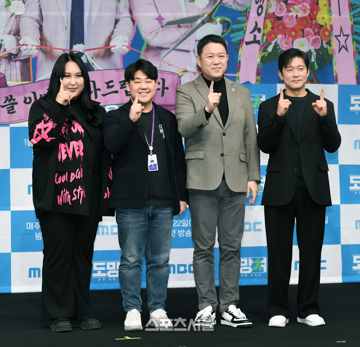 방송인 풍자, 조철영 PD, 방송인 김구라, 아나운서 김대호(왼쪽부터)가 22일 서울 마포구 MBC 골든마우스홀에서 진행된 ‘도망쳐 : 손절 대행 서비스’ 제작발표회에서 취재진을 향해 포즈를 취하고 있다.