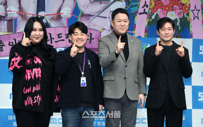 방송인 풍자, 조철영 PD, 방송인 김구라, 아나운서 김대호(왼쪽부터)가 22일 서울 마포구 MBC 골든마우스홀에서 진행된 ‘도망쳐 : 손절 대행 서비스’ 제작발표회에서 취재진을 향해 포즈를 취하고 있다.
