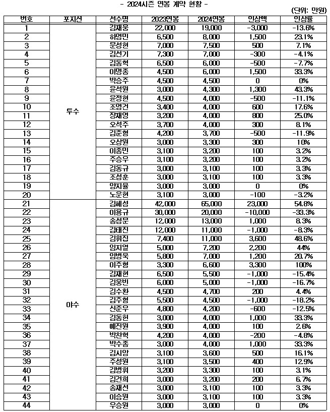 키움은 22일 “2024시즌 연봉 계약 대상자(신인, 육성, 군보류, FA, 비FA 다년계약, 외국인 선수 제외) 44명 전원과 연봉 계약을 완료했다”고 밝혔다.