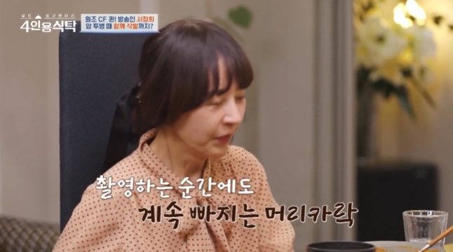 유방암 투병을 했던 서정희는 “머리를 감을 때 한 움큼씩 빠지기 시작하는 거다. 하루가 다르게 막 빠지는 거다. 하는 수 없이 단발로 먼저 잘랐다. 마음에 준비를 해야 하니까 긴 머리에서 일단 단발을 했다. 그런데 더 이상 지체할 수가 없겠다 해서 바로 다음날 미용실 예약을 하려고 하는데 미용실 머리 밀면 많은 사람들이 쳐다보고 하니까 ‘제가 깎아드릴게요’ 했다. 그래도 나도 여자니까 부끄러워서 싫다고 했다. 어느 날 빨리 오라고 하는 거다. 왜 그런가 하고 집에 갔는데 혼자서 머리를 빡빡 깎고 (머리 밀어줄) 준비를 하고 있는 거다. 근데 갑자기 내 마음이 그냥 왠지 마음의 신뢰를 하면서 이런 따뜻한 사람이면, 표현은 안 했지만 늘 배려해 주고 늘 나이스하니까 몰랐다. 머리를 깎은 모습을 보고 울컥한 데다 내 머리를 깎는데 나도 막 가슴이”라고 당시를 떠올리며 울컥했다.