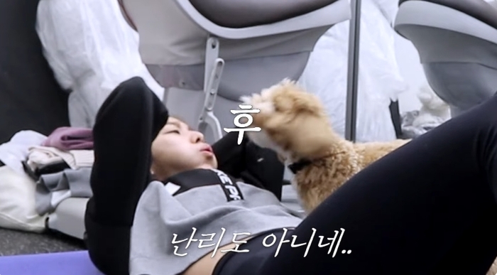 윗몸일으키기를 하던 유이는 브라탑만 입은 채 선명한 복근도 공개했다.