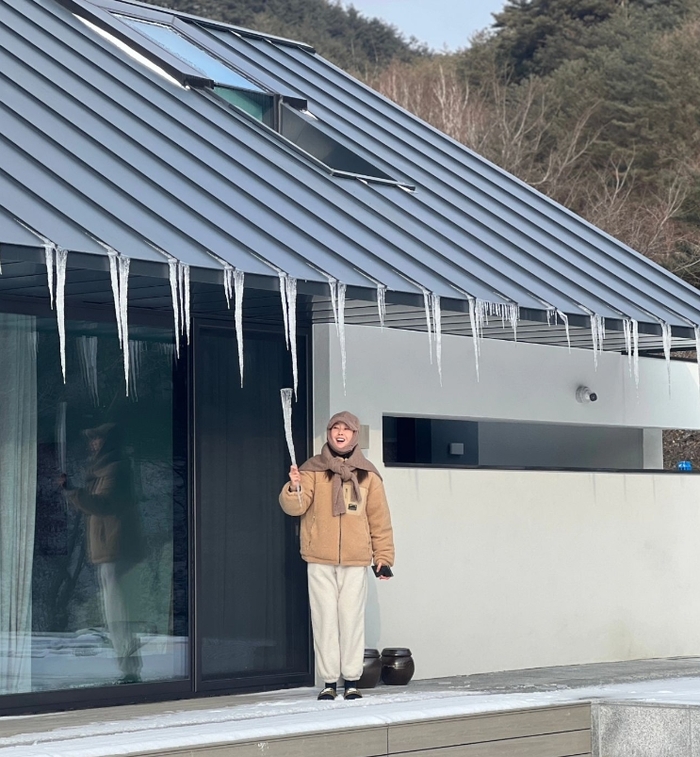 한혜진은 22일 자신의 채널에 폭설에 하얗게 덮인 집앞과 거대한 고드름이 처마에 주렁주렁 매달린 모습을 공개했다.