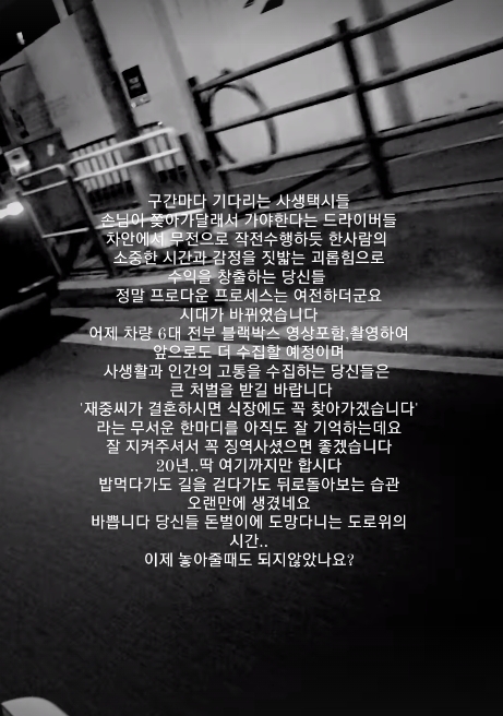 그는 “구간마다 기다리는 사생택시들. 손님이 쫓아가 달래서 가야한다는 드라이버들. 차안에서 무전으로 작전수행하듯 한 사람의 소중한 시간과 감정을 짓밟는 괴롭힘으로 수익을 창출하는 당신들. 정말 프로다운 프로세스는 여전하더라”라며 분노했다.