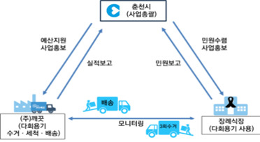 춘천시는 작년 12월 다회용기 사용 지원사업을 추진하고자 관내 장례식장 4개소, ㈜깨끗, 춘천환경운동연합 간에 ‘장례식장 다회용기 사용 활성화’에 대한 업무 협약을 체결했다.