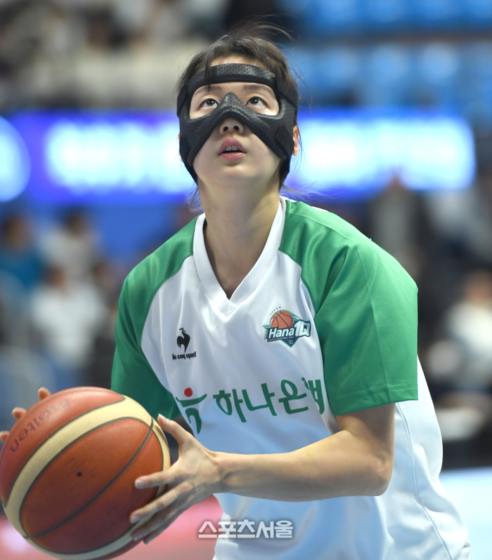 부천 하나원큐 신지현이 24일 인천 도원체육관에서 열리는 2023-2024 여자프로농구 인천 신한은행과 경기에 앞서 몸을 풀고 있다. 신지현은 17일 아산 우리은행전에서 4쿼터 상대 선수 팔꿈치에 얼굴을 맞아 코뼈가 골절됐다. 교정 수술을 받은 그는 마스크를 착용하고 출전할 예정이다. 2024. 1. 24. 도원 | 최승섭기자 thunder@sportsseoul.com