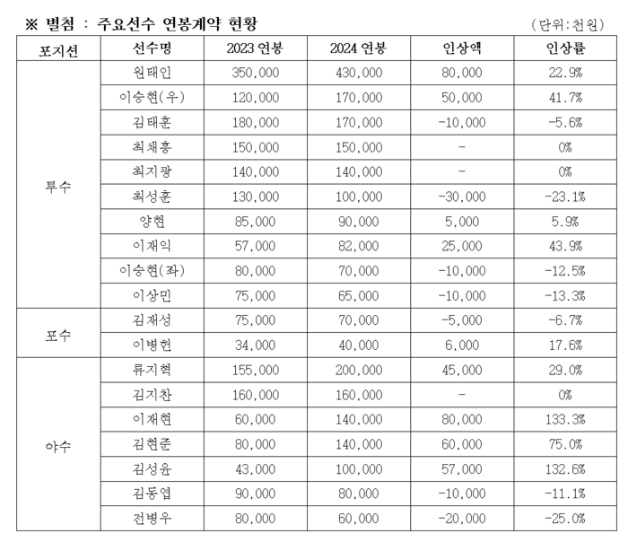 투수 원태인은 기존 3억5000만원에서 22.9% 인상된 4억 3000만원에, 내야 유틸리티로 활약한 류지혁은 기존 1억5500만원에서 4500만원 인상된 2억원에 계약을 마쳤다.