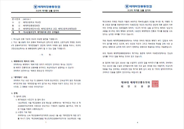 배재학당 총동창회는 24일 총동창회 게시판을 통해 ‘배재고 이효준 교장에게 공개질의서를 보냈다’라며 질의서를 공개했다.