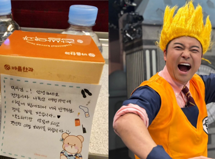 첫 번째 사진 속에는 선물로 받은 간식이 기차 테이블에 놓여있다. 간식 상자에 붙어있는 편지에는 “무무님..! 안녕하세요. 전참시와 나혼산 애청자인데 이렇게 뵙게 되어 너무 반가워요. 정말 정말 팬입니다..♥ 약소하지만 맛있게 드시고 편안한 여정 보내시길 바랍니다”라고 적혀있다.