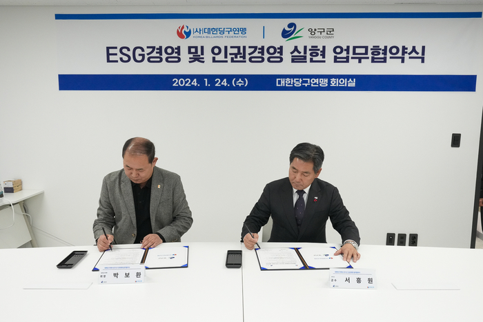 [스포츠서울 | 김용일 기자] 대한당구연맹(KBF)은 지난 24일 강원도 양구군과 인권 경영 실현을 위한 업무협약을 체결했다.