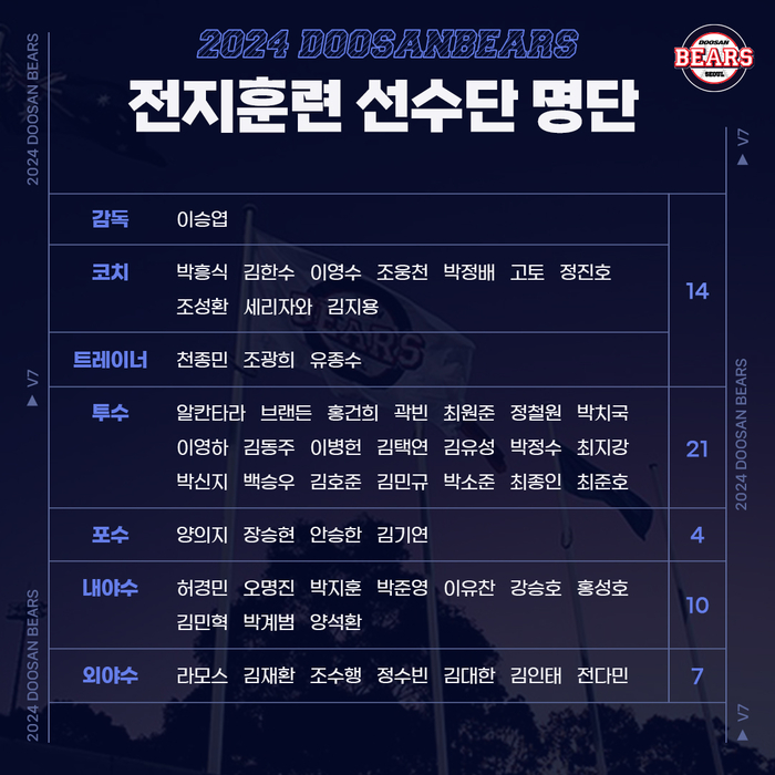 캠프 인원은 이승엽 감독을 포함한 코칭스태프 14명, 선수 42명 등 총 56명이다. 앞서 지난 20일 양의지, 양석환, 김재환, 정수빈, 장승현, 김인태, 박준영, 이영하, 김동주 9명의 선수들은 선발대로 출국했다.
