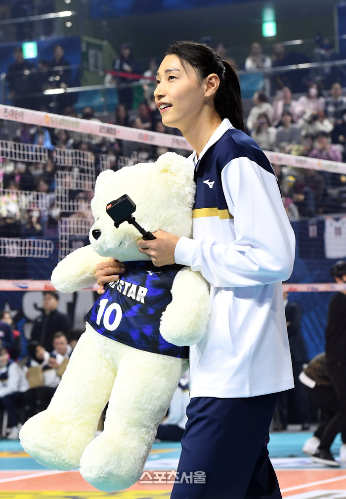 흥국생명 김연경이 27일 인천 삼산월드체육관에서 열린 2023-2024 V리그 올스타전에서 최다팬투표 상을 받은 뒤 대형 곰인형을 전달하기 위해 팬에게 다가가고 있다. 2024. 1. 27. 인천 | 박진업 기자 upandup@sportsseoul.com