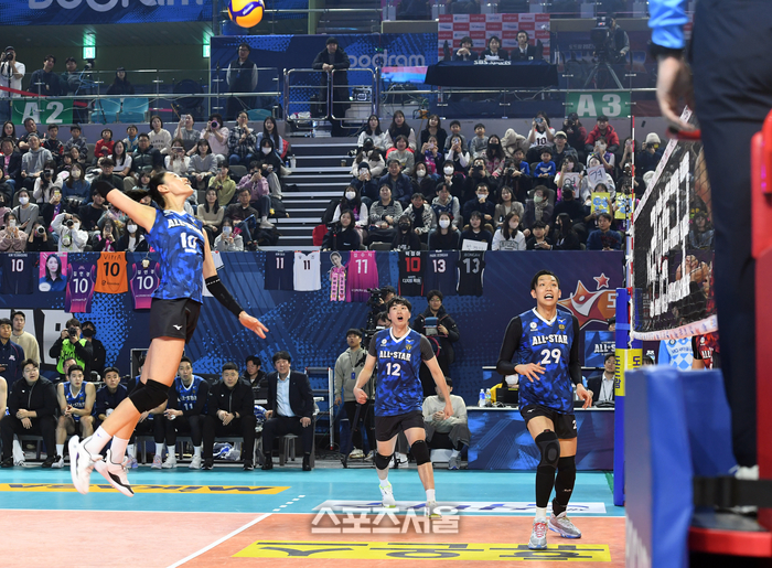 V스타 김연경이 27일 인천 삼산월드체육관에서 열린 2023-2024 V리그 올스타전에서 남자부 경기를 함께 뛰며 스파이크 공격을 하고 있다. 2024. 1. 27. 인천 | 박진업 기자 upandup@sportsseoul.com