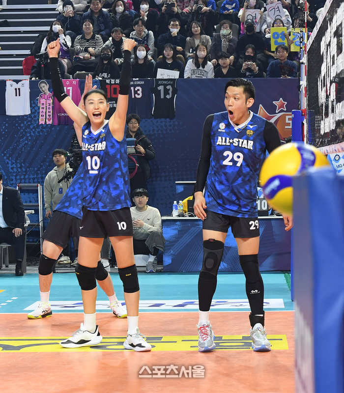 V스타 김연경이 27일 인천 삼산월드체육관에서 열린 2023-2024 V리그 올스타전에서 남자부 경기를 함께 뛰며 득점을 한 뒤 기뻐하고 있다. 2024. 1. 27. 인천 | 박진업 기자 upandup@sportsseoul.com