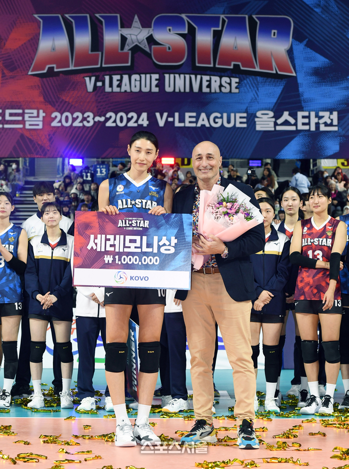 흥국생명 김연경(왼쪽)이 27일 인천 삼산월드체육관에서 열린 2023-2024 V리그 올스타전에서 음악 ‘내 귀에 캔디’에 맞춰 아본단자 감독과 함께 춤을 춰 세레모니상을 수상한 뒤 기념촬영을 하고 있다. 2024. 1. 27. 인천 | 박진업 기자 upandup@sportsseoul.com
