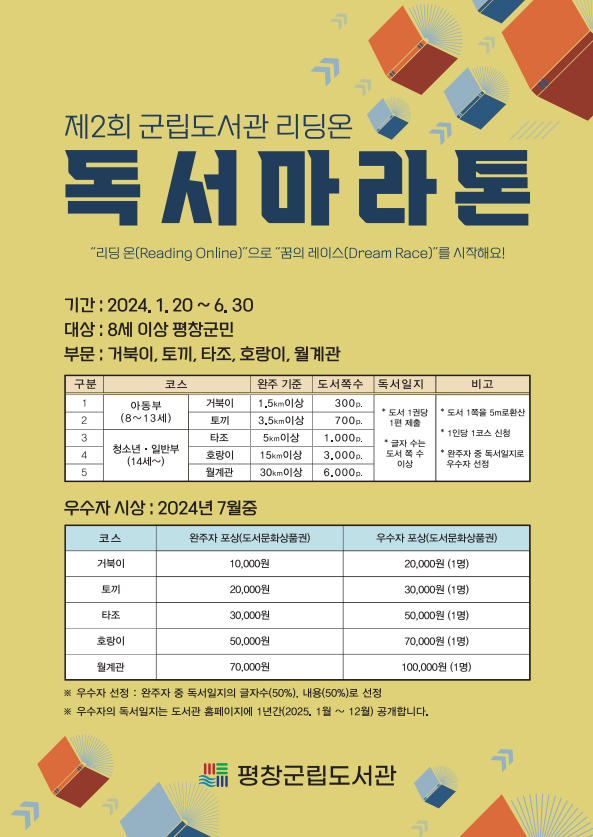 ‘독서마라톤’은 독서를 마라톤에 비유, 본인의 독서량으로 정해진 거리를 완주하면 다양한 혜택을 주는 온라인 독서운동이다. 2023년에 이어 올해로 2회째를 맞이하고 있는 평창군 독서마라톤 대회는 작년과 동일한 코스 – 거북이, 토끼, 타조, 호랑이, 월계관 - 에, 독서 1쪽을 5m 달린 것으로 환산하여 정해진 완주 기준에 도달한 참여자에게 완주증 제공, 도서문화상품권 시상, 군립도서관 대출권수 확대 등의 혜택을 제공할 예정이다.